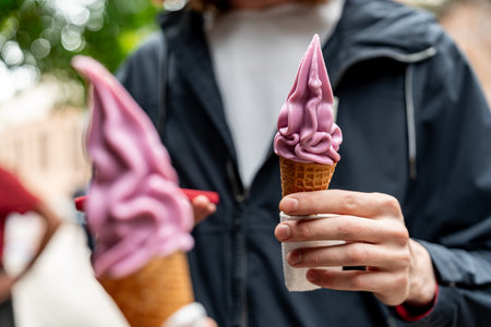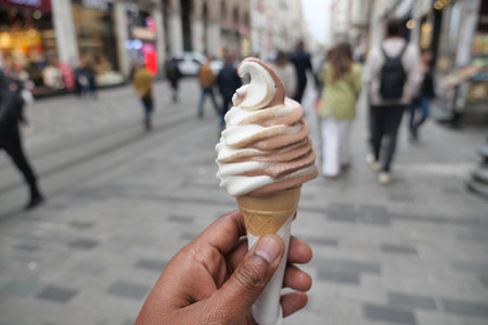 Enjoying swirled ice cream in a lively city street