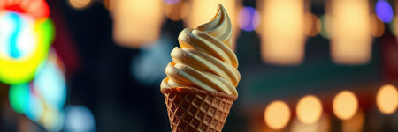 Delicious soft serve ice cream cone enjoyed at a vibrant night market with bright lights and festive atmosphere