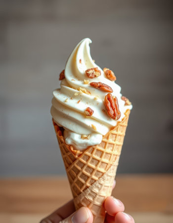 Delicious soft serve ice cream cone topped with crunchy pecans in a cozy setting