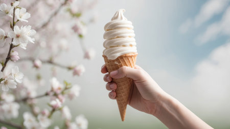 AI Generated. Hand Holding Soft Serve Ice Cream Cone in Spring Blossom Landscape