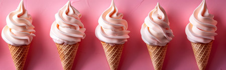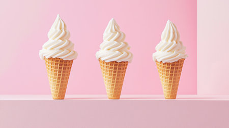 Three perfectly swirled soft serve ice cream cones against a soft pink backdrop create a bright and inviting atmosphere. Ideal for summer-themed projects.