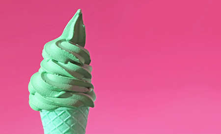 Pastel Green Pistachio Flavored Soft Serve Ice Cream Cone on Bubblegum Pink Backdrop