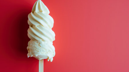Soft-serve vanilla ice cream melting on a wooden stick against a red background