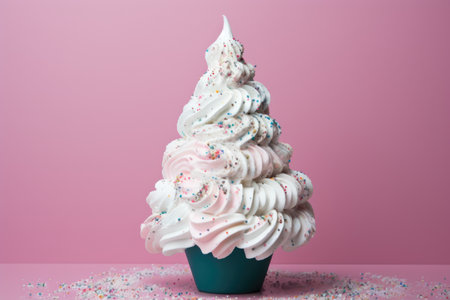 Christmas tree made from fluffy whipped meringue cream, sprinkled with dipping dots on a minimal pink color background