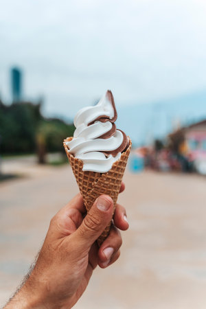 Two-tone soft serve ice cream cone in hand, close up