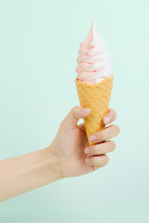 A female's hand holding delicious soft ice cream in a crispy waffle cone on blue background