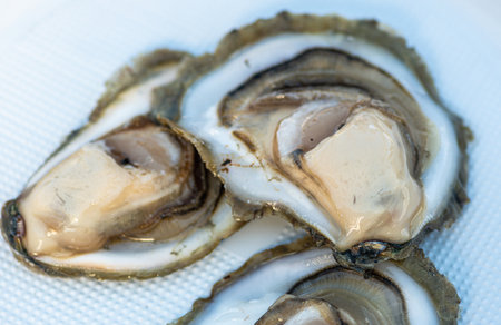 Fresh raw oysters ready to eat on a plate in a street fish market in Bari, Puglia, Italy