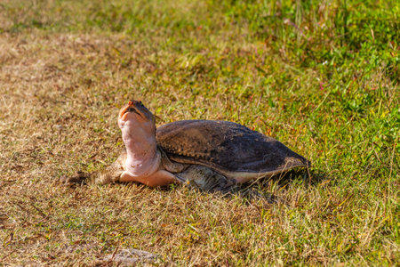 A closeup of a Florida softshell turtle on the grass during dayli