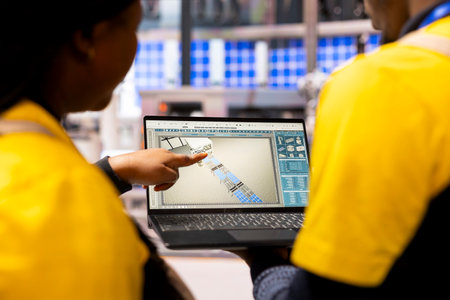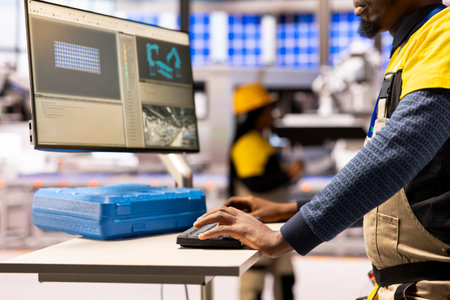 Closeup of professional technician optimizing solar energy performance on digital interface. The image highlights automated factory expert using computer to oversee machinery in smart manufacturing.