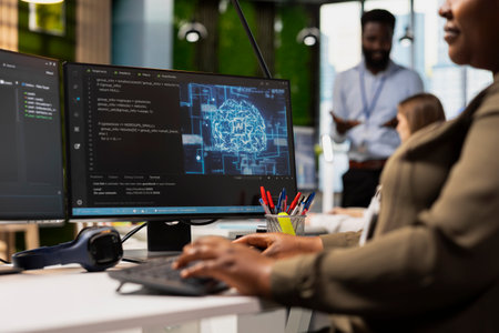 Close up of computer scientist speeding up tasks by following AI language model suggestions in office. IT expert relying on artificial intelligence LLM assistant technology to fix errors
