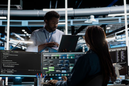 Technician and colleague use AI cognitive computing to extract information from complex data on laptop. Close up of teamworking IT experts using artificial intelligence on notebook