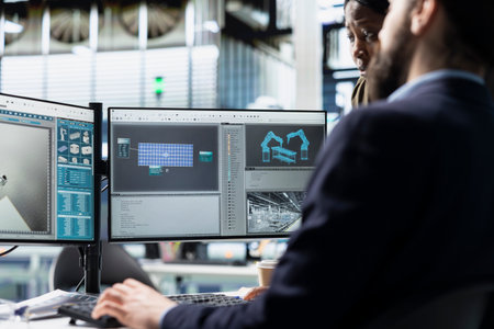 Software developer in office using AI LLM assistant to design solar panel cells. Worker uses neural network machine learning to develop robotic arm systems for solar panel production
