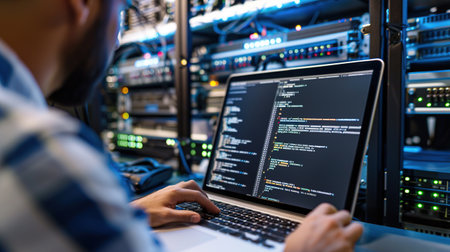 Focus on laptop used by data center system administrators using artificial intelligence neural networks. Close up of AI programming language on notebook screen used by server farm employees