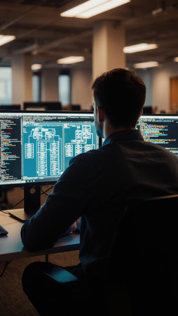 Extreme close up of software interface on PC screens showing lines of code running in empty room. Hacking malware programming script on displays, handheld camera shot