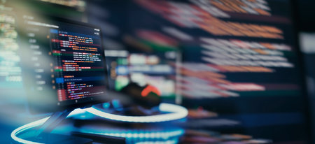 In a dimly lit room, multiple screens glow with complex lines of code, showcasing the intricate process of software development.