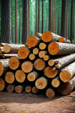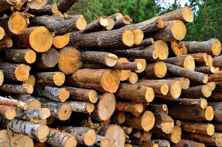 Stack of cut pine tree logs in a forest. Wood logs, timber logging, industrial destruction, forests Are Disappearing, illegal logging