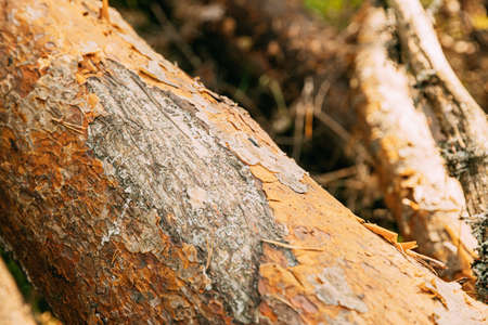 Several logs in a clearing against the background of the forest. Pine bark close-up .. Site about woodworking industry, lumberjack, felling, ecology, forest, tree.