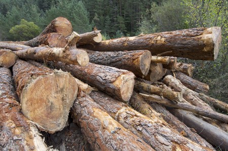group of pine logs felled in a forest, Anso valley, Pyrenees, Huesca, Aragon, Spain