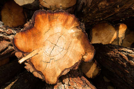 The texture of the many sections of the trunks of freshly sawn pines in wood harvesting