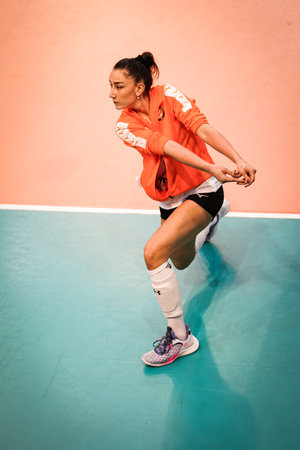 ISTANBUL, TURKEY - MAY 03, 2022: Hande Baladin warming up before Eczacibasi Dynavit vs Turk Hava Yollari Turkish Sultans League Playoff 3-4 match in Eczacibasi Sport Hall