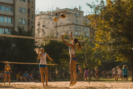 Female volleyball players engaged in a spirited practice session under the sun in an urban park, showcasing their athletic skills with a served ball being caught