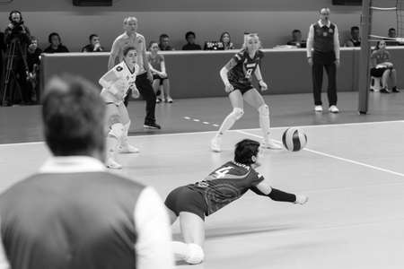 ODESSA, SOUTH, UKRAINE - October 15, 2019: Women's European Volleyball Championship. Female KHIMIK YUZHNY - MLADOST ZAGREB Croatia. CEV Champions League Volley 2020. Women's Intense Volleyball Game