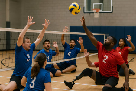 Players with and without disabilities engage in an inclusive volleyball match, showcasing teamwork and diversity on the court