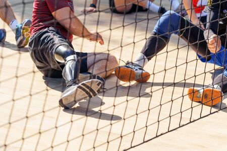 Amputee athletes playing sitting volleyball. Professional players .