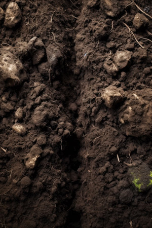 A detailed close-up image capturing the rich, dark texture of soil with visible organic particles, ideal for gardening and agricultural purposes. The soil appears moist and fertile, ready for planting. AI generated image