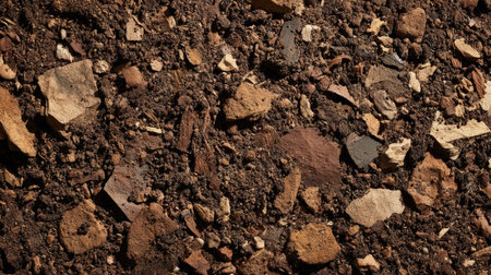 A detailed close-up image capturing the rich, dark texture of soil with visible organic particles, ideal for gardening and agricultural purposes. The soil appears moist and fertile, ready for planting. AI generated image