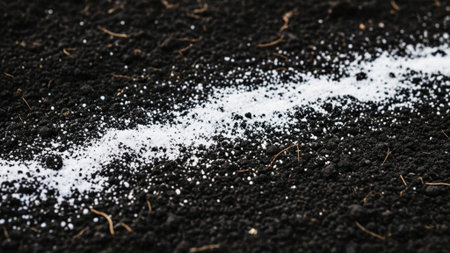 Cinematic ultrawide 8K still life of dark, fertile garden earth lightly dusted with white granular mineral supplement, symbolizing spring planting.