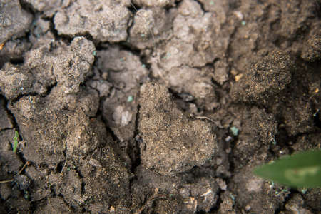 Cracked Ground. Aridity. Soil in dry season, hot summer. Drought of earth, background, patterns, texture. Top view. Close-up. Selective focus.