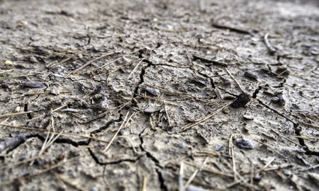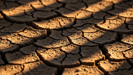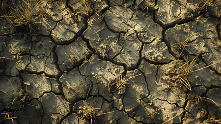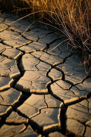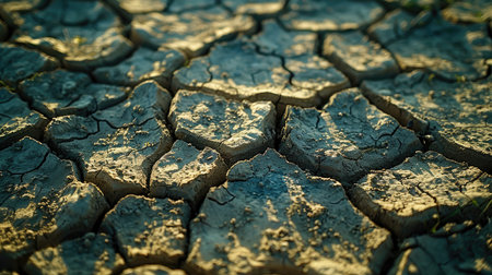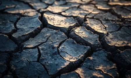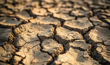 This close-up image showcases the cracked surface of dry soil, emphasizing the effects of drought and climate change on landscapes and their ecosystems.