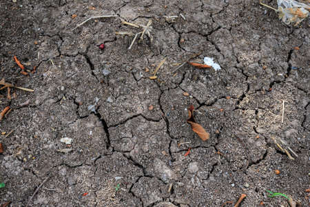 Cracked ground with dry leaves, cracked ground for background. Top view and close-up
