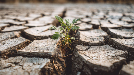 A small green plant emerges from dry, cracked earth, suggesting resilience. The image features a close-up composition, highlighting textures and details. The warm lighting and earth tones create a sense of hope. Suitable for illustrating environmental themes or concepts related to endurance and overcoming challenges.