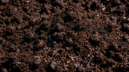 A detailed close-up image capturing the rich, dark texture of soil with visible organic particles, ideal for gardening and agricultural purposes. The soil appears moist and fertile, ready for planting. AI generated image