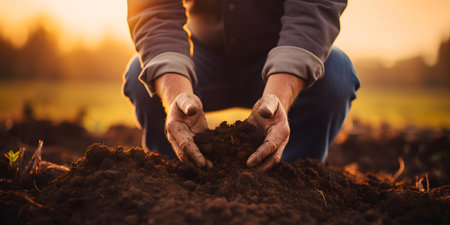A close-up of a farmer's hands gently cradling rich, dark soil, symbolizing the essence of agriculture, hard work, and connection to the land.