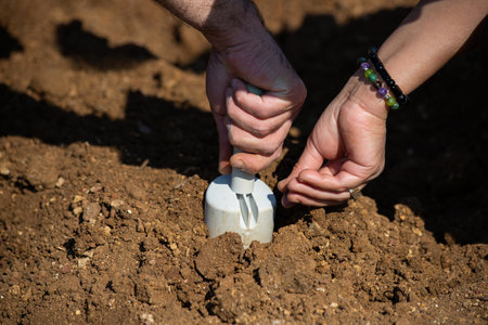 Sowing season. Sowing seeds closeup. Planting seeds soil ground earth garden soil farm garden ground. Seeding plant farm ground. Seedbed. Fertile land. Fertile ground. Agriculture planting vegetables