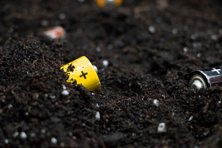 Used batteries in the ground. Hazardous waste polluting the environment. The concept of environmental protection and the recycling of batteries and batteries