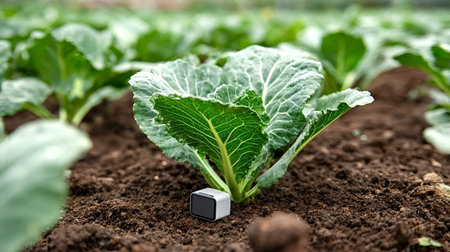 Soil sensor measuring moisture and nutrients near a young cabbage plant in cultivated brown earth. Representing precision agriculture. Iot technology. And sustainable crop monitoring in modern farming