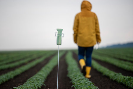 Close up of rain gauge with water after rain in soil,. Female farmer walking in field between soybean rows in field