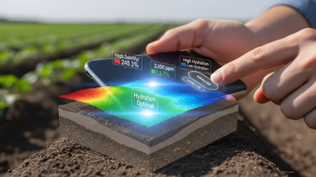 Farmer utilizing smart technology for real-time soil hydration and salinity analysis in field