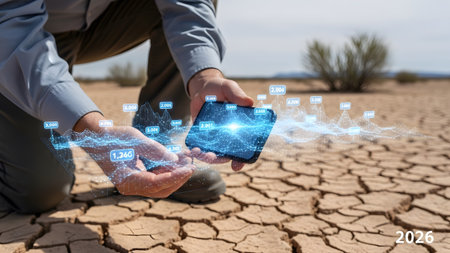 A man crouches on dry cracked earth, holding a smartphone with a glowing blue digital data graph...