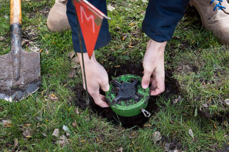 miner digs a mine. Demining of the territory. the guys digs a mine on a minefield. service in army. hazardous work. digging the ground with a sapper shovel. bury mine close up. Anti-personnel mine