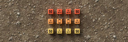 cube grid with smartphone and computer icons and text 5G on dirt gravel background - 3d illustration