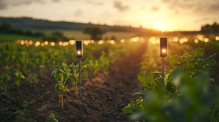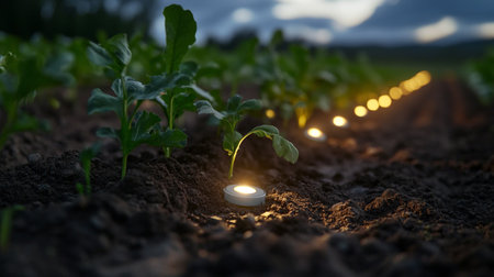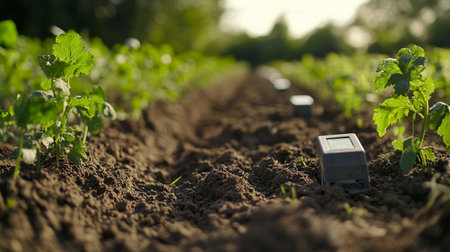 A finger presses a glowing microchip embedded in dark soil next to small green sprouts under a...