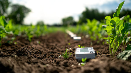 Green soil moisture meter placed in a garden setting among young plants, measuring soil moisture levels and aiding agriculture or gardening efforts in dry, sunlit conditions