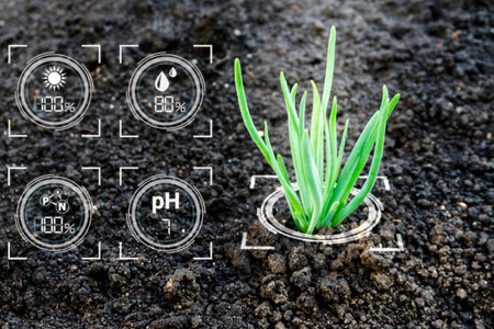 Smart garden concept with chives and controlled soil. Intelligent gardening with optimal soil moisture, pH and temperature.