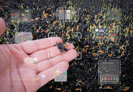 Garden showing close-up of glowing hands interacting with holographic soil analysis showing...
