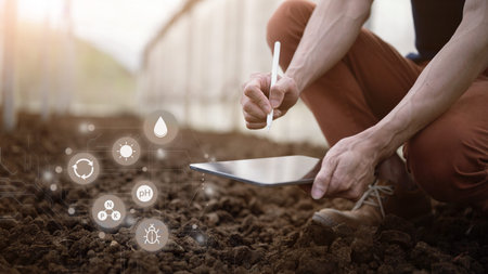Farmer checks soil quality by hand using digital data icons to analyze nutrients pH moisture with tablet.